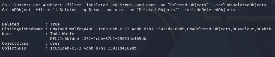 DistinguishedName : CN=Recycle Bin Feature,CN=Optional Features,CN=Directory Service,CN=Windows NT,CN=Services,CN=Configuration,DC=voleur,DC=htb