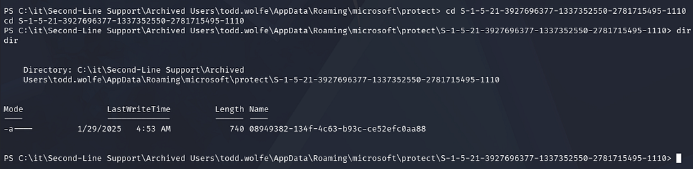 cd "C:\it\Second-Line Support\Archived Users\todd.wolfe\AppData\Roaming\microsoft\protect\S-1-5-21-3927696377-1337352550-2781715495-1110"