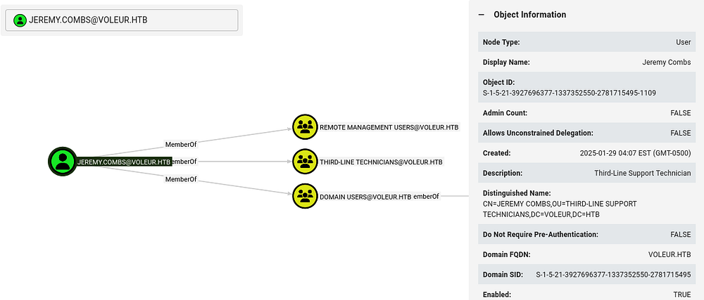 This rewards us with domain credentials for Jeremy.Combs and We can generate another Kerberos ticket to get WinRM access, similar to the svc_winrm account earlier. BloodHound shows that this user is in the Third-Line Technicians group, giving him access to that directory on the SMB share.
