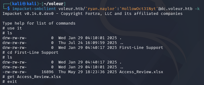 $ impacket-smbclient voleur.htb/'todd.wolfe':'[REDACTED]'@dc.voleur.htb -k