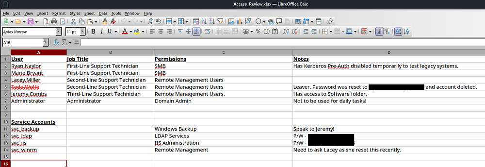 Usually this would be a shot in the dark as service accounts have complex passwords (as seen with the two recovered), but referring back to the Access Control spreadsheet, there was a note disclosing that a support technician recently reset it.