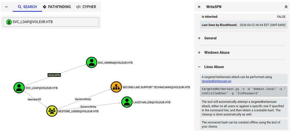 Taking some time to let BH ingest the JSON files, I start by looking at what outbound object control permissions that the accounts we control have. A bit of analyzing shows that the svc_ldap account has WriteSPN permissions over the svc_winrm account, meaning we’re able to perform a targeted Kerberoasting attack and attempt to crack the NTLM hash offline.