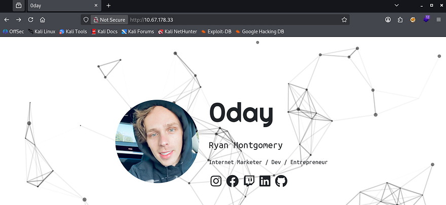 Checking the landing page shows a page for Ryan’s social media accounts, but not much else. Nothing on robots.txt either, so I fire up gobuster to leave subdirectory/subdomain scans running in the background.