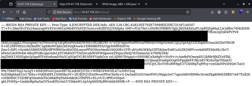 However, checking /backup reveals an RSA private key probably used to gain access to SSH in case of something disastrous.