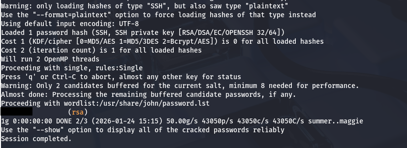 JohnTheRipper or Hashcat will crack this with ease and we can SSH onto the server. There’s just one problem first, we still don’t have a username for the server and attempts with Ryan or 0day didn’t work.