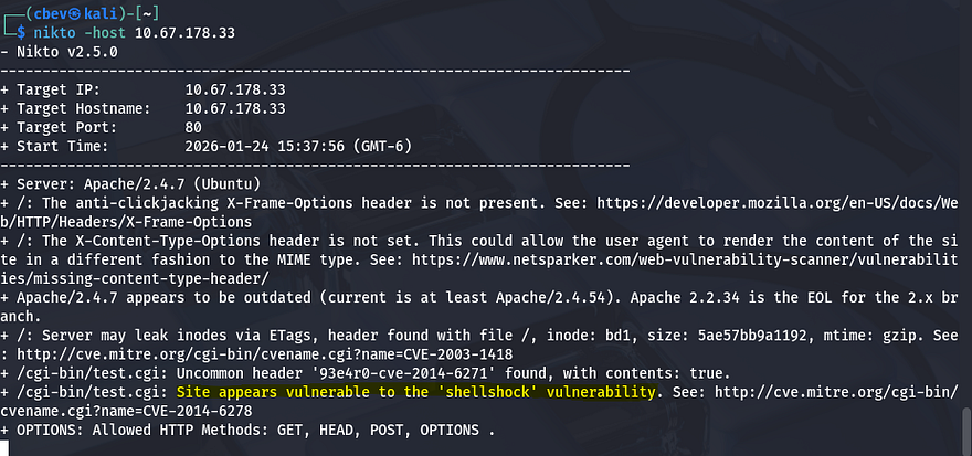 Running a vulnerability scanner like Nikto (or Nuclei) on the web server rewards us big time. It appears to be prone to a very old CVE-2014–6278 (Shellshock) which allows for RCE on the system due to how bash parses function definitions in the values of environment variables.