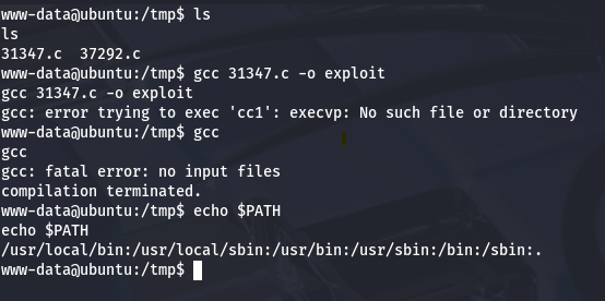 Attempting to compile the exploit on the system throws an error saying there is no such file or directory of ‘cc1’. Since we know that GCC is indeed on the box, this is most likely a $PATH issue.