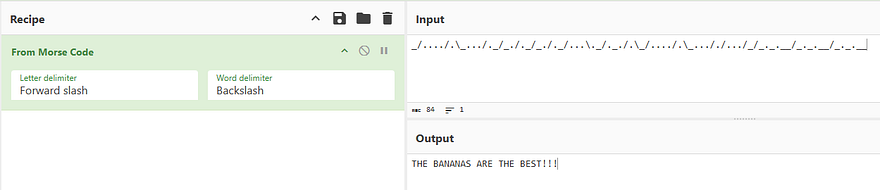 A bit of waiting rewards me with an endpoint at /bananastock. Inside is a picture of two guards speaking, and one of them gives us a password encoded in a strange format. I take to CyberChef once again to decode this.