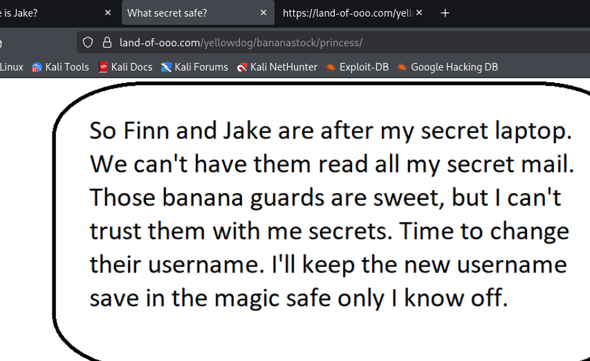 Here, Princess Bubblegum discloses that she changed the username for her laptop to be something only she knows of and that it’s being kept in a magical safe. Looking at the source code gives us more info to use: