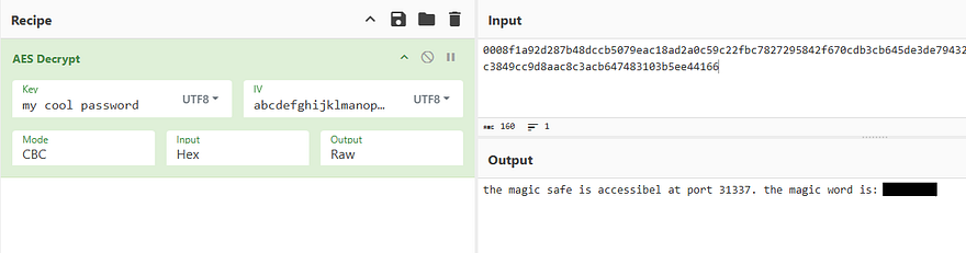 All these fields make me think that the secret text is AES encrypted, so it’s back to CyberChef. Using the parameters gathered to decrypt the string gives us the magic word to open the safe on port 31337.