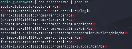 In reality we can just sign in via SSH as this new user along with the password gathered from the guards step. Now it’s time to find routes to escalate privileges to other users. Looking in the /home directory shows there are a ton of other users on the box which may make it confusing to pivot.