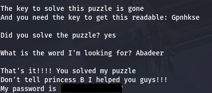 At this point we can grab the second flag and restart enumeration to take over someone else’s account. There is a secret message in her home directory with yet another puzzle.