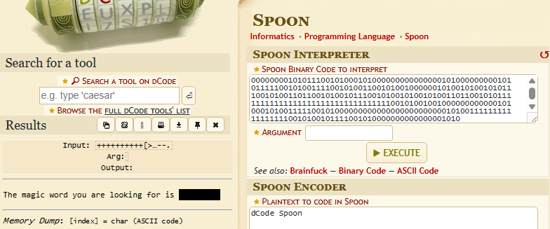 At first I thought this was binary due to the concatenated string of ones and zero’s but that returned nothing. After a while I did some more digging and found another type of programming language called Spoon that looks similar to it. I use a decoder found on boxentriq to get the magic word.