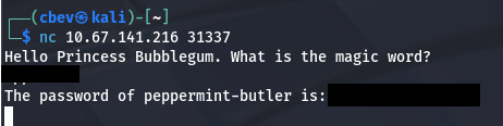 There was nowhere else to enter that prompted a magic word so I went back to port 31337 to see if it was successful there and got the password for the peppermint-butler user.