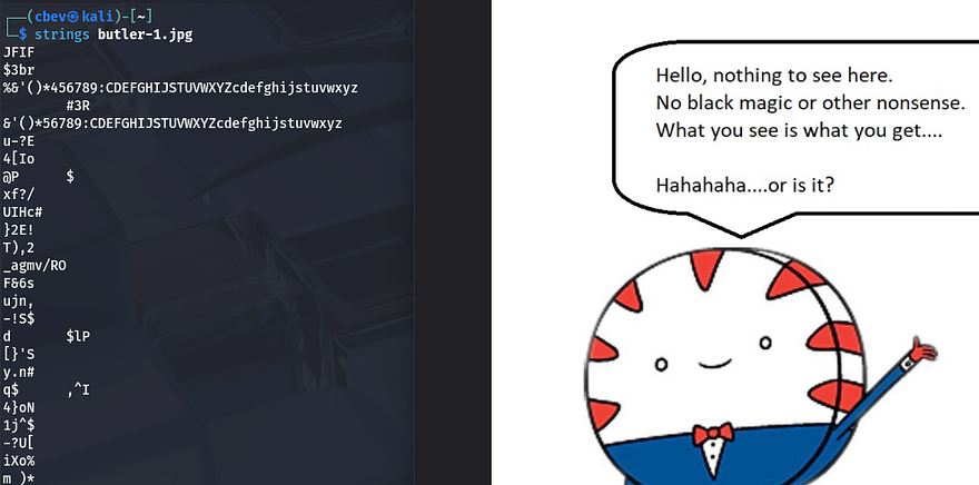 Switching users will give us the third flag under their home directory as well as a butler picture. I transfer the .jpg over to my attacking machine for further inspection over SSH and notice some strange data while using the strings utility.