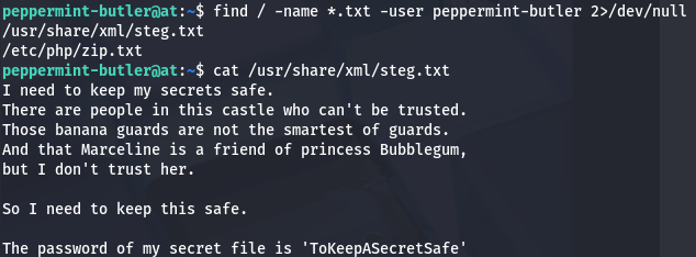 This doesn’t work to extract anything with a blank passphrase so I go back to enumerating internally, looking for any files owned by our current account. This grants me a steg.txt file under the /usr/share/xml directory which gives us the passphrase to use on the picture.