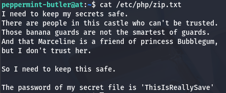 In the guard’s home directory is our first flag as well as a mailbox. Inside that is a letter from Marceline saying she hid a file for us to find.
