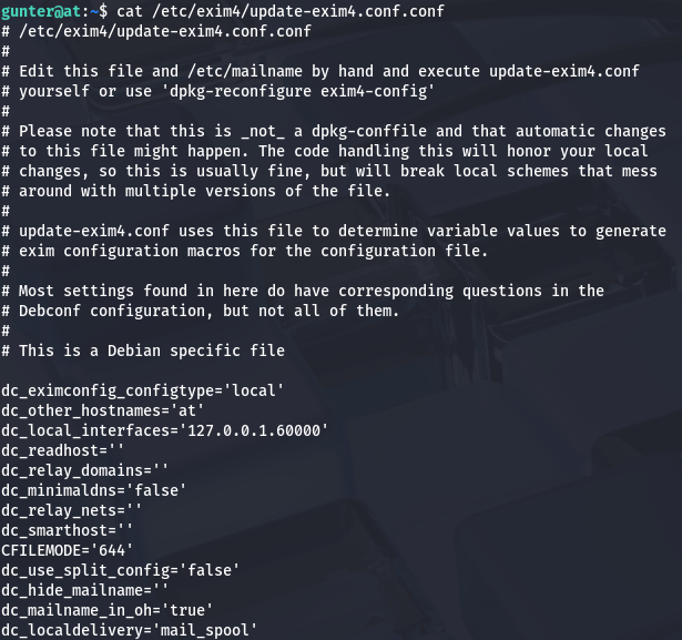 To do so, first we need to read the configuration files to know where it’s supposed to be running at. The default location to check this is at /etc/exim4/update-exim4.conf.conf .