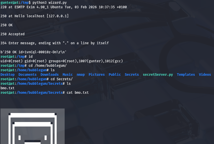 Finally, executing that script will escalate privileges to root user and we can grab the reset code for BMO in Princess Bubblegum’s Secrets directory.