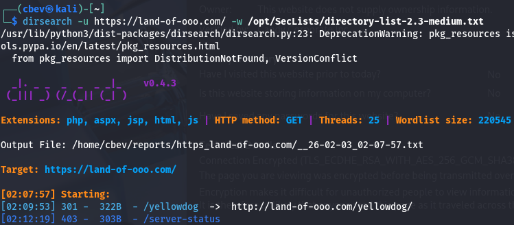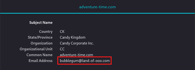 The landing page on port 80 has nothing on it, and my scans didn’t return anything either. On the other hand, HTTPS gives us a certificate to look at. There is a username of bubblegum as well as a different site at land-of-ooo.com which we can add to our /etc/hosts file.