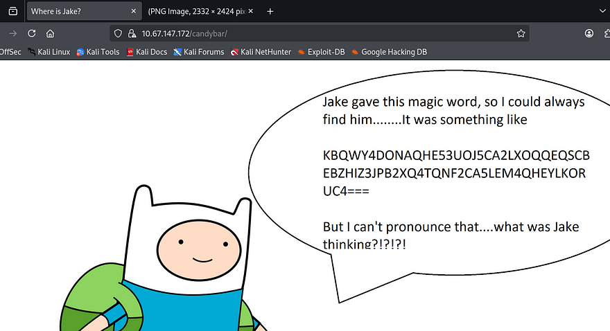 On this page, Finn tells us a magic word that Jake gave him in case we ever needed to find him. It’s encoded so I send it to CyberChef to get the plaintext version.