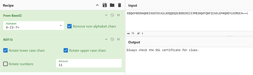 The correct recipe to decode is From Base32 -> ROT11. It really only hints at checking the SSL certificate again so it looks like we should head over to the land-of-ooo.