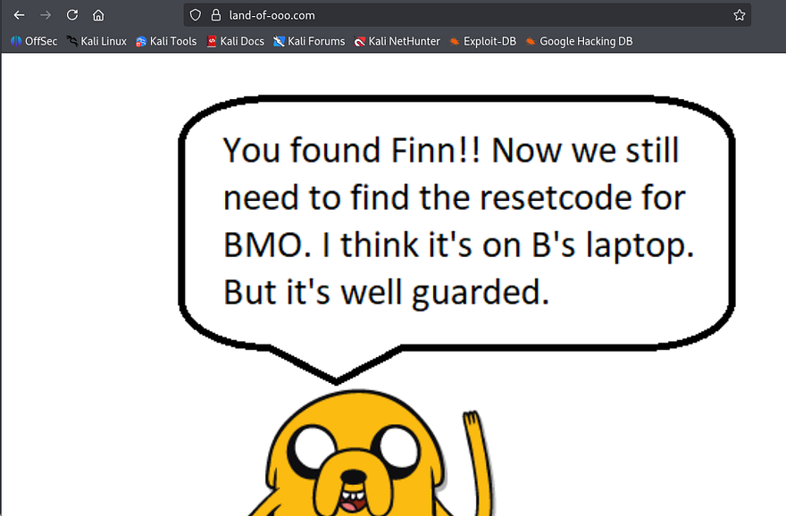 Checking the landing page shows that we found Jake. We still need to find a reset code for BMO and it may be on his laptop with security in place. I restart a Dirsearch on this domain and wait for any hits.