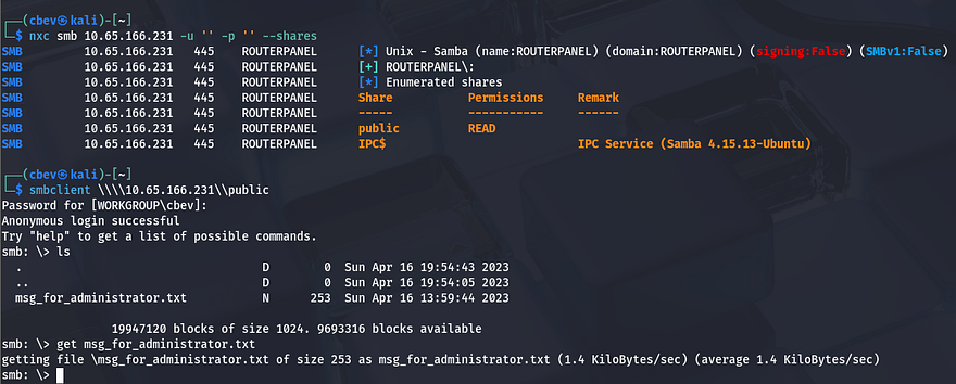 It is indeed enabled and we have read permissions on a public share. Looking inside it shows a text file containing a message for an administrator, not meant for us but this could be quite useful. Here are the contents: