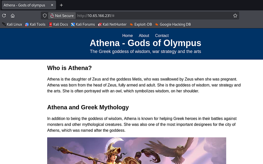 Checking out the landing page shows some history on the Greek goddess Athena, and also gives us a few names to stash on a list in case we need to brute force at some point.