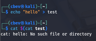For example, if I make a file and store the command cat [FILE] inside of a variable which then gets called by another cat command, it will still throw an error, but our command gets executed and printed as part of it.