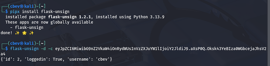 The only thing on our dashboard is a welcome message to the index page and a logout button. We’ll have to rely on enumeration heavily so I’ll spend a lot a time there. I also notice that we’re given a Flask session cookie and unsigning it shows that it holds our username and a couple of other values.
