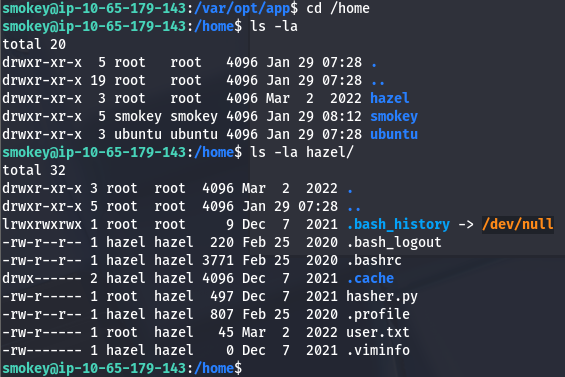 The only other users on the system are hazel and root, so we’ll likely have to pivot to her account before fully compromising it. I go about the usual routes for privesc as a low level user by searching for SUID bits set, loose Sudo permissions, encrypted backups on a share, but those do not return anything interesting.