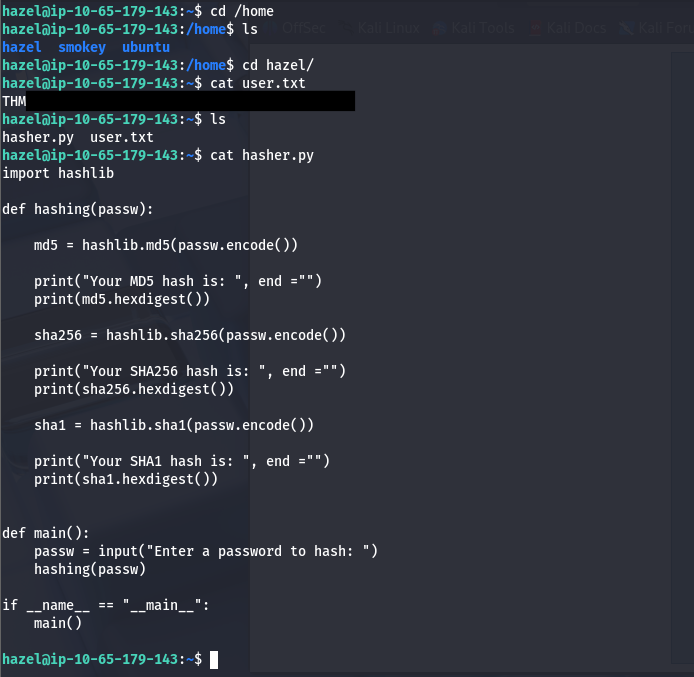 After signing in on her account, we can start looking at routes to escalate privileges to root. Along with the user flag in her home directory, there is a python script which hashes a password three separate times using MD5, SHA256, and SHA1 to create a secure string for storage.