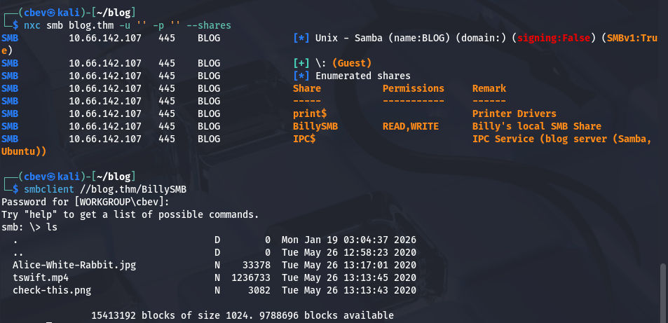 We have read and write permissions for a shared named BillySMB. There are three files on the share that are pretty useless for us (a QR code to a Billy Joel song, a Taylor Swift song on mp4 and an Alice in wonderland picture).