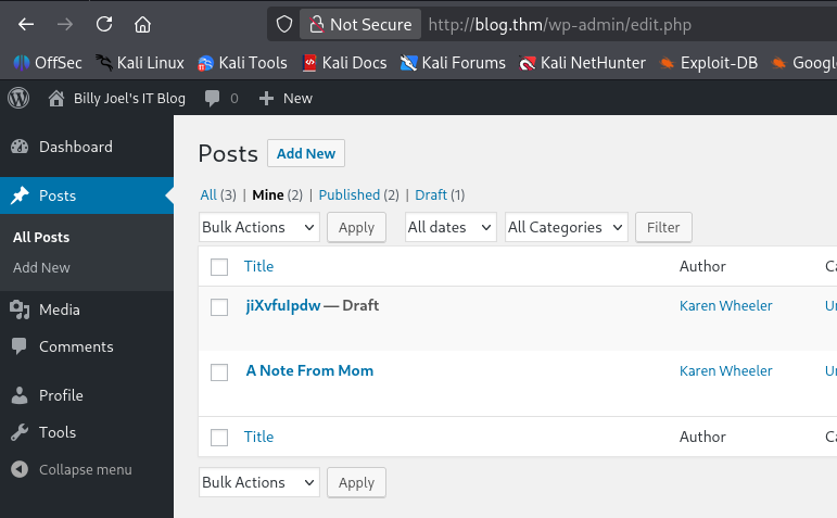 We can login to the site as Karen but there’s not much to do as she’s not an admin. There is a draft post with the title of a (maybe) random string though.